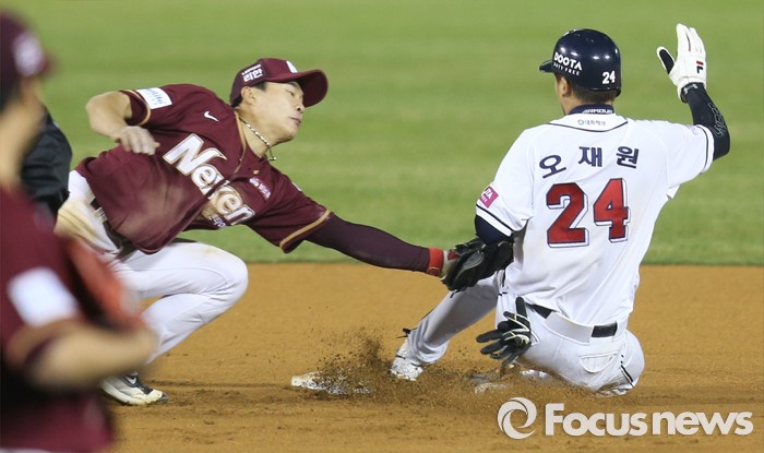(서울=포커스뉴스) 8일 서울 잠실구장에서 열린 2016 프로야구 넥센-두산 경기 6회말 볼넷으로 진루한 두산 오재원이 오재일 타석때 넥센 투수 오재영의 견제구에 걸렸으나 1루수 채태인의 송구 실책으로 2루에서 세이프되고 있다.