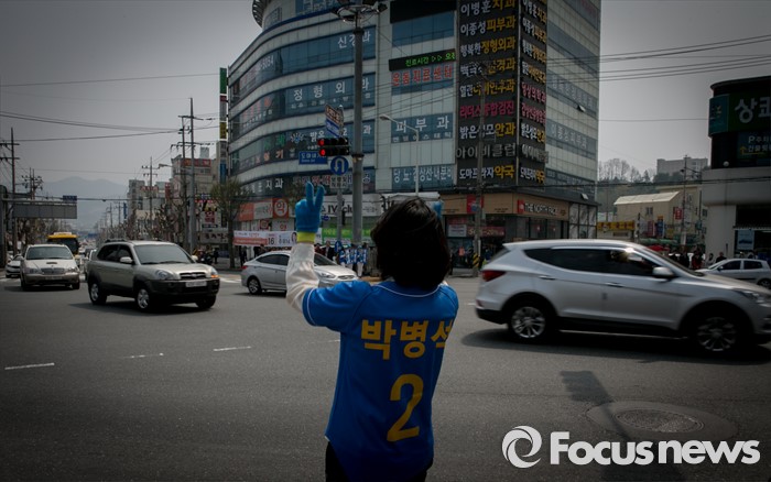 (대전=포커스뉴스) 9일 오후 대전 서구 도마네거리에서 박병석 더불어민주당 대전서구갑 후보의 선거운동원이 지지를 호소하고 있다.