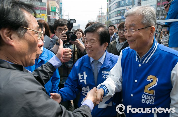 (대전=포커스뉴스) 9일 오후 대전 서구 도마네거리에서 김종인(오른쪽) 더불어민주당 비대위 대표 겸 선대위원장과 박병석 대전서구갑 후보가 선거유세를 마친 뒤 시민 및 지지자들과 인사하며 지지를 호소하고 있다.