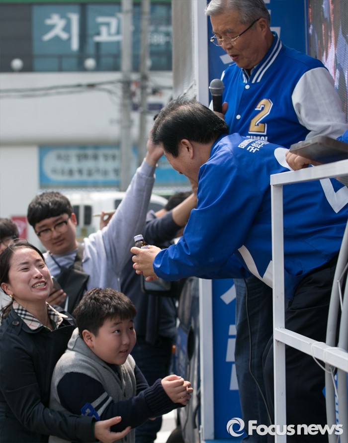 (대전=포커스뉴스) 9일 오후 대전 서구 도마네거리에서 김종인(가운데) 더불어민주당 비대위 대표 겸 선대위원장과 박병석(오른쪽) 대전서구갑 후보가 선거유세를 하며 지지를 호소하던 중 지지자로부터 음료를 선물받고 있다.