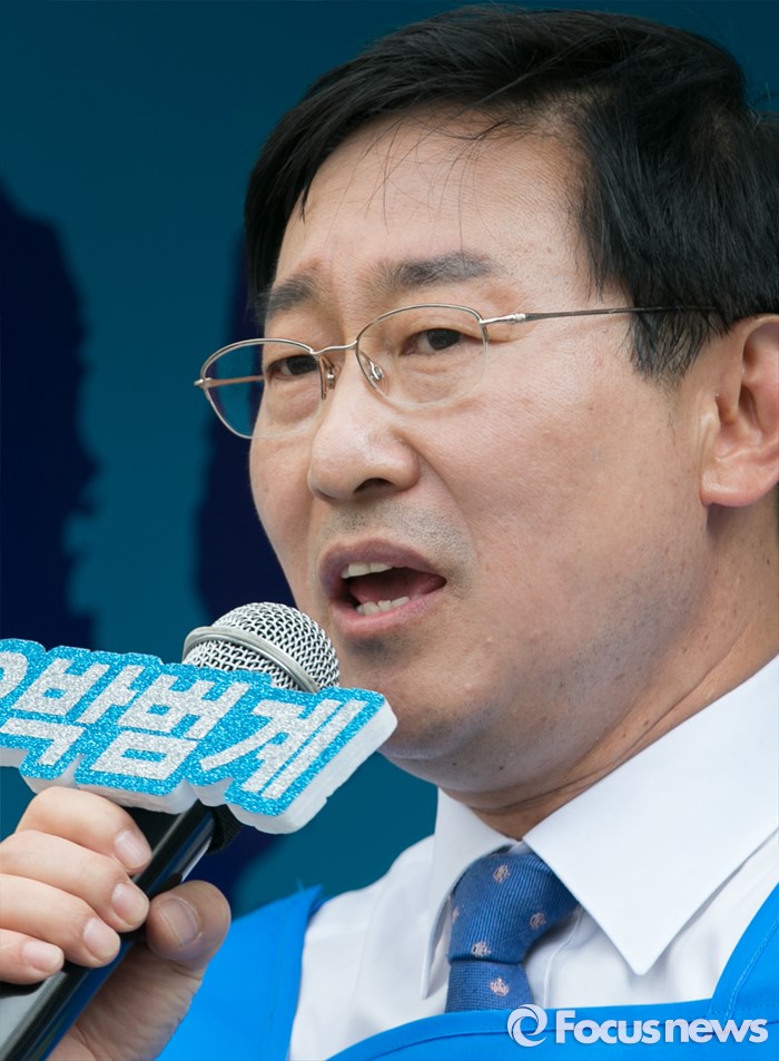 (대전=포커스뉴스) 9일 오후 대전 갤러리아백화점 타임월드점 앞에서 열린 더불어민주당 대전 서구 합동유세에 참석한 박범계 서구을 후보가 지지를 호소하고 있다.