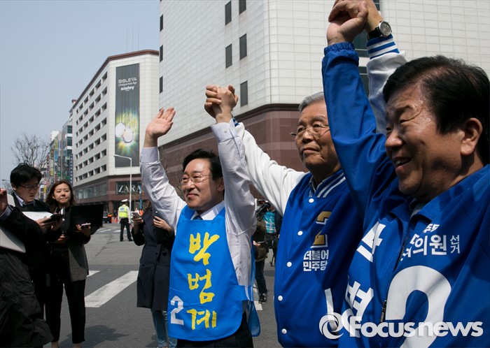 (대전=포커스뉴스) 9일 오후 대전 갤러리아백화점 타임월드점 앞에서 열린 더불어민주당 대전 서구 합동유세에 참석한 김종인(가운데) 비대위 대표 겸 선대위원장, 박범계(왼쪽) 서구을, 박병석 서구갑 후보가 손을 들어 지지를 호소하고 있다.