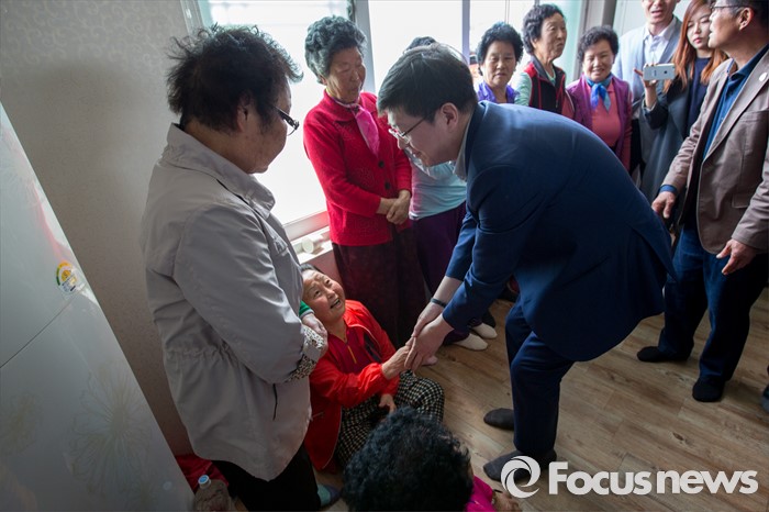 (광주=포커스뉴스) 김홍걸 국민통합위원장이 9일 오전 광주광역시 서구 발산마을회관을 방문해 어르신들과 인사 하고 있다.