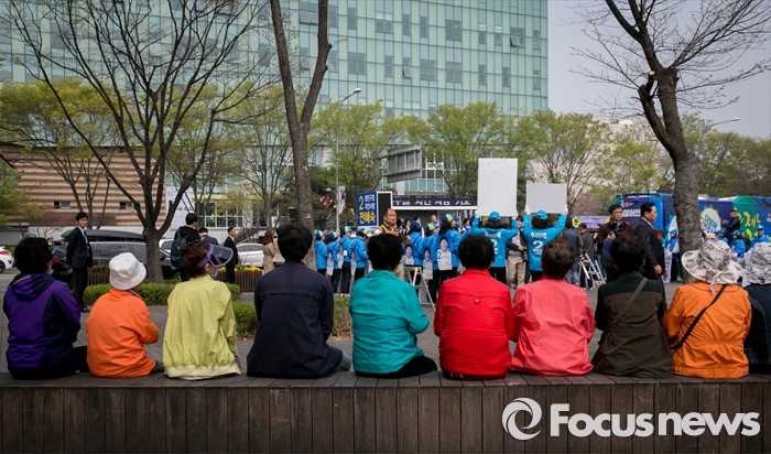 (서울=포커스뉴스) 10일 오전 서울 어린이대공원 앞에서 시민 및 지지자들이 김종인 더불어민주당 비대위 대표 겸 선대위원장과 전혜숙 광진갑 후보의 선거유세를 지켜보고 있다.