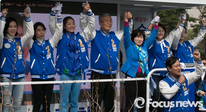 (서울=포커스뉴스) 김종인(왼쪽 네번째) 더불어민주당 비대위 대표 겸 선대위원장과 전혜숙(오른쪽 세번째) 광진갑 후보, 비례대표 후보들이 10일 오전 서울 어린이대공원 앞에서 손을 들어 인사하며 지지를 호소하고 있다.