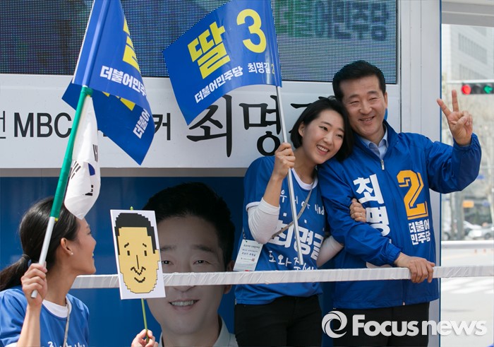 (서울=포커스뉴스) 최명길(오른쪽) 더불어민주당 송파을 후보가 10일 오전 서울 석촌호수 서호 인근 거리에서 선거유세 중 셋째 딸(가운데)과 함께 포즈를 취하고 있다.