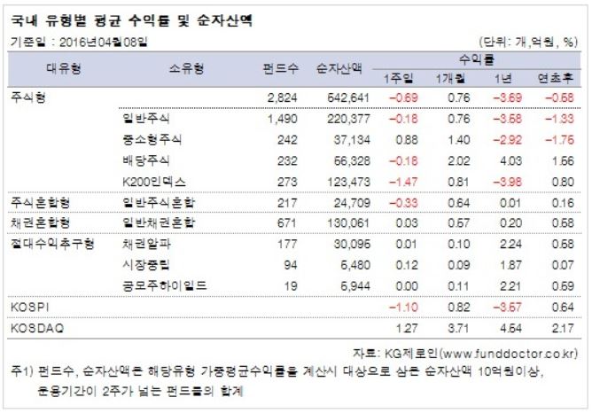 10일 펀드평가사 KG제로인이 지난 8일 공시된 기준 가격으로 펀드 수익률을 조사한 결과, 전체 국내 주식형펀드는 한 주간 0.69% 하락했다.