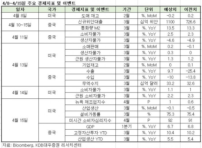 오는 15일(현지시간)에는 중국의 1분기 국내총생산(GDP)이 발표될 예정이다. 중국 1분기 GDP 시장 추정치는 6.7% 증가로, 전분기 6.8% 대비 소폭 둔화될 것으로 전망된다.
