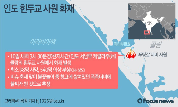 (서울=포커스뉴스) CNN보도에 따르면 인도 서남부 케랄라주의 한 힌두교 사원에서 10일(현지시간) 새벽 큰불이 나 98명이 숨지고 540명 이상 크게 다쳤다.