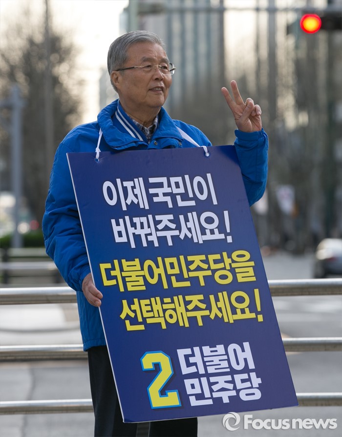 (서울=포커스뉴스) 20대 총선을 이틀 앞둔 11일 오전 서울 지하철 선릉역 인근 사거리에서 김종인 더불어민주당 비대위 대표 겸 선대위원장이 투표독려 캠페인을 하고 있다.