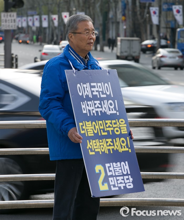 (서울=포커스뉴스) 20대 총선을 이틀 앞둔 11일 오전 서울 지하철 선릉역 인근 사거리에서 김종인 더불어민주당 비대위 대표 겸 선대위원장이 투표독려 캠페인을 하고 있다.