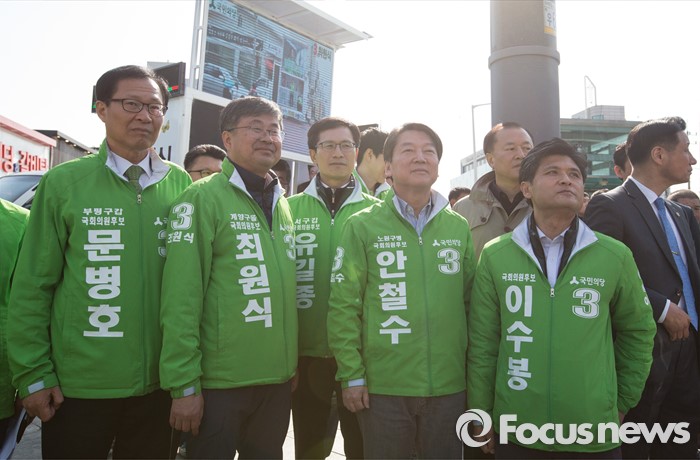 (인천=포커스뉴스) 안철수 국민의당 상임공동대표(오른쪽 두번째)가 11일 오전 인천시 계양구 계양역 앞에서 계양구을 최원식 후보, 계양구갑 이수봉 후보 합동 지원 유세를 하고 있다.