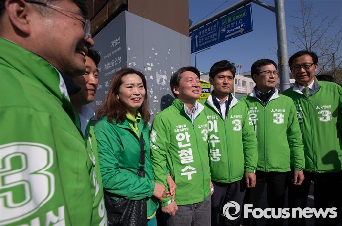 (인천=포커스뉴스) 안철수 국민의당 상임공동대표(가운데)가 11일 오전 인천시 계양구 계양역 앞에서 계양구을 최원식 후보, 계양구갑 이수봉 후보(오른쪽 세번째) 합동 지원 유세를 하고 있다.