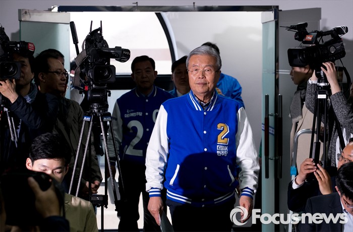 (수원=포커스뉴스) 20대 총선을 이틀 앞둔 11일 오전 수원 장안구 더불어민주당 경기도당 회의실에서 김종인 비대위 대표 겸 선대위원장이 대국민 성명 발표를 위해 수원 지역 후보들과 함께 입장하고 있다.