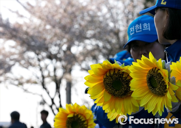 (서울=포커스뉴스) 20대 총선을 이틀 앞둔 11일 오전 서울 지하철 수서역 인근 거리에서 전현희 더불어민주당 강남을 후보의 선거운동원들이 지지를 호소하고 있다.