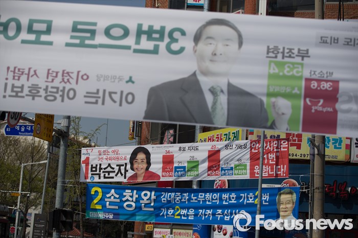 (안산=포커스뉴스) 안철수 국민의당 상임공동대표(가운데)가 11일 오전 안산시 단원구 고잔성당 사거리에서 부좌현 안산시 단원구을 후보 지원유세를 하고 있는 가운데 각 정당 후보들의 선거 현수막이 보이고 있다.