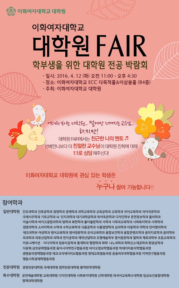 이화여대 대학원에 따르면 이날 오전 11시부터 오후 4시 30분까지 서울 서대문구에 위치한 본교 ECC(Ewha Campus Complex·이화캠퍼스복합단지) 지하 4층 다목적홀·이삼봉홀에서 대학원 FAIR를 개최한다.