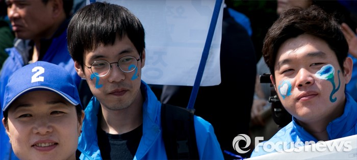 (군포=포커스뉴스) 20대 총선을 이틀 앞둔 11일 오후 경기도 군포 당동우체국 사거리에서 열린 더불어민주당 군포지역 합동유세에 참여한 선거운동원들이 지지를 호소하고 있다.