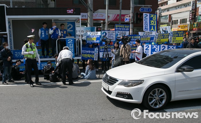 (군포=포커스뉴스) 20대 총선을 이틀 앞둔 11일 오후 경기도 군포 당동우체국 사거리에서 열린 더불어민주당 군포지역 합동유세에 불편을 겪는 차량들을 위해 경찰들이 교통정리를 하고 있다.