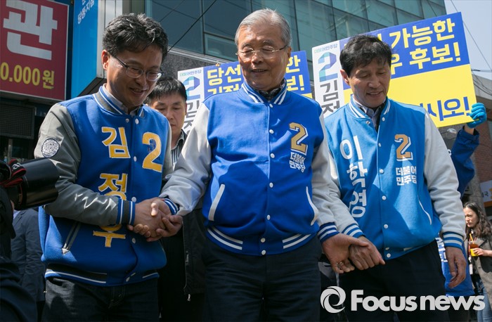 (군포=포커스뉴스) 20대 총선을 이틀 앞둔 11일 오후 경기도 군포 당동우체국 사거리에서 더불어민주당 군포지역 합동유세를 마친 김종인(가운데) 비대위 대표 겸 선대위원장이 김정우(왼쪽) 군포갑, 이학영 군포을 후보와 함께 이동하고 있다.