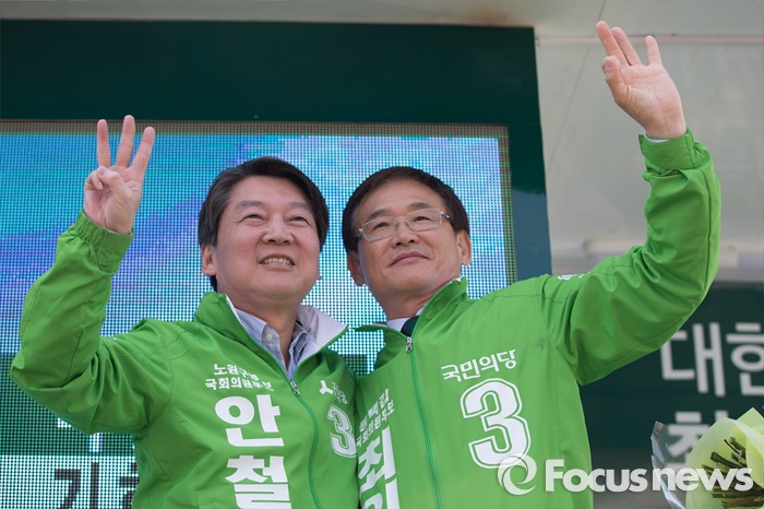 (평택=포커스뉴스) 안철수 국민의당 상임공동대표(왼쪽)가 11일 오후 안산시 평택역 광장 앞에서 최인규 평택시갑 후보 지원 유세를 하고 있다.