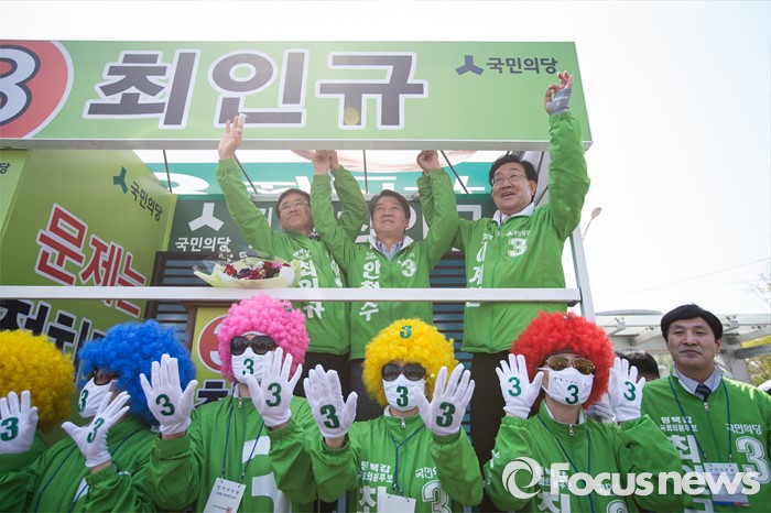 (평택=포커스뉴스) 안철수 국민의당 상임공동대표(가운데)가 11일 오후 안산시 평택역 광장 앞에서 이계안 평택시을 후보(오른쪽)와 최인규 평택시갑 후보 지원 유세를 하고 있다.