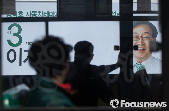 (평택=포커스뉴스) 11일 오후 안산시 평택역 광장 앞에서 국민의당 이계안 평택시을 후보와 최인규 평택시갑 후보가 합동 선거운동을 하고 있는 가운데 버스를 탄 유권자들이 선거 차량에 붙은 선거 포스터를 보고 있다.