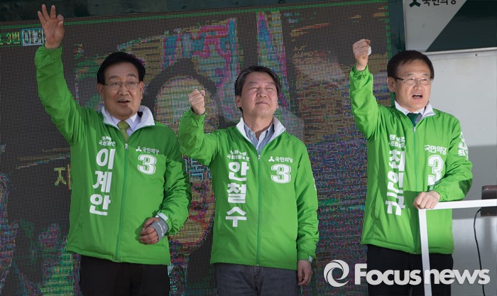 (평택=포커스뉴스) 안철수 국민의당 상임공동대표(가운데)가 11일 오후 안산시 평택역 광장 앞에서 이계안 평택시을 후보(왼쪽)와 최인규 평택시갑 후보 지원 유세를 하고 있다.