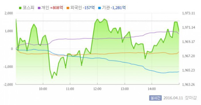 이날 일본 닛케이225지수는 전거래일 대비 0.4% 하락한 1만5751.13으로 마감했다.11일 유가증권시장 <그래픽출처=네이버>