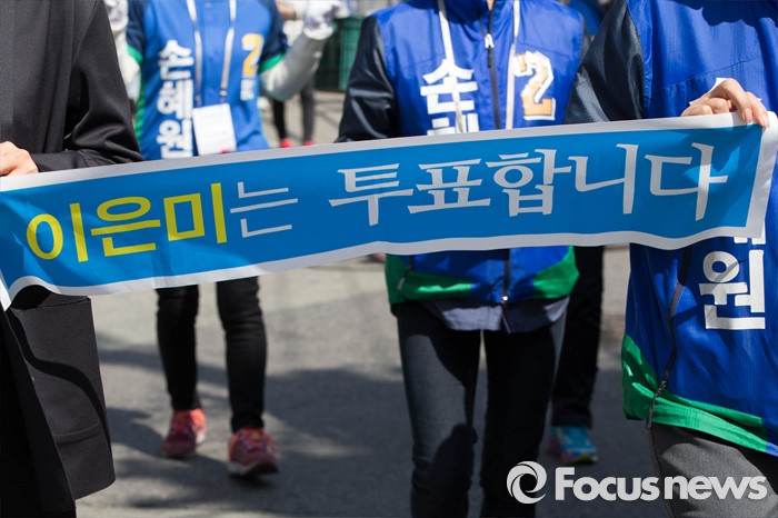 (서울=포커스뉴스) 20대 총선을 이틀 앞둔 11일 오후 서울 마포구 망원시장 일대에서 손혜원 더불어민주당 마포구을 후보가 가수 이은미와 함께 선거유세를 하고 있다.