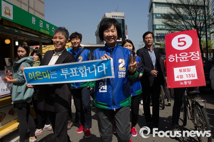 (서울=포커스뉴스) 20대 총선을 이틀 앞둔 11일 오후 서울 마포구 망원시장 일대에서 손혜원 더불어민주당 마포구을 후보가 가수 이은미와 함께 선거유세를 하고 있다.