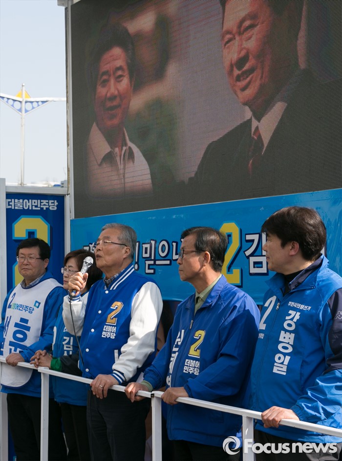 (부천=포커스뉴스) 20대 총선을 이틀 앞둔 11일 오후 경기도 부천역 남부광장에서 열린 더불어민주당 부천지역 합동유세에 참석한 김종인(왼쪽 세번째) 비대위 대표 겸 선대위원장이 지지를 호소하고 있다.