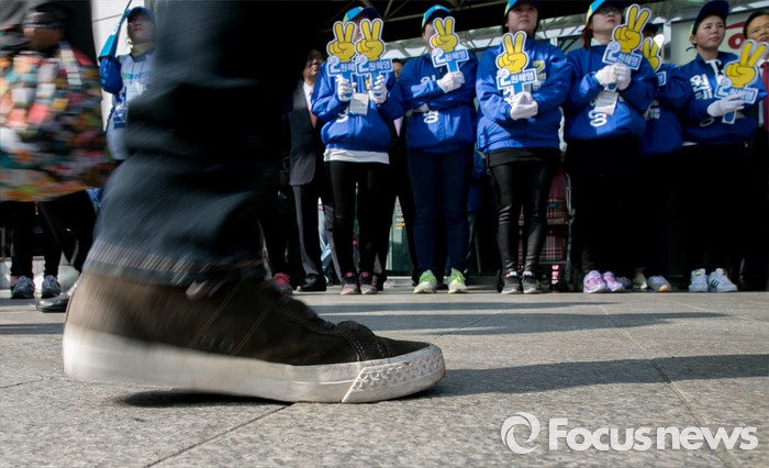 (부천=포커스뉴스) 20대 총선을 이틀 앞둔 11일 오후 경기도 부천역 남부광장에서 열린 더불어민주당 부천지역 합동유세에 참여한 선거운동원들이 지지를 호소하고 있다.