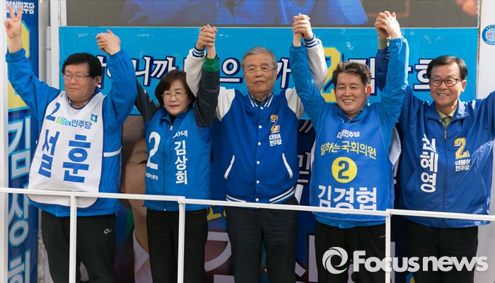 (부천=포커스뉴스) 20대 총선을 이틀 앞둔 11일 오후 경기도 부천역 남부광장에서 열린 더불어민주당 부천지역 합동유세에 참석한 김종인(왼쪽 세번째) 비대위 대표 겸 선대위원장이 지지를 호소하고 있다. 왼쪽부터 설훈 원미을, 김상희 소사구 후보 ,김 대표, 김경협 원미갑, 원혜영 오정구 후보.