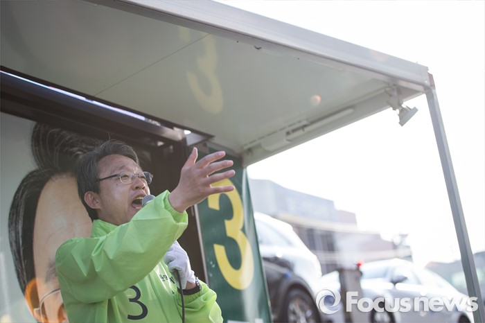 (서울=포커스뉴스) 김성식 국민의당 관악갑 후보가 11일 오후 서울 관악구 롯데백화점 앞에서 선거운동을 하고 있다.