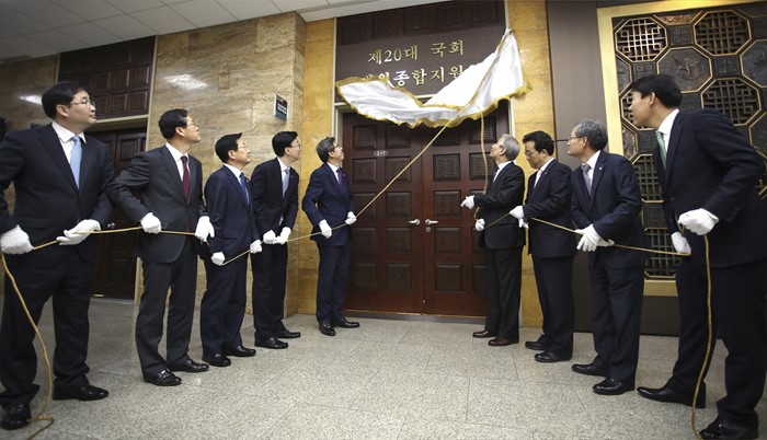 (서울=포커스뉴스) 20대 총선을 이틀 앞둔 11일 서울 여의도 국회에서 열린 20대 국회 개원종합지원실 개소식에 참석한 박형준(왼쪽 다섯번째) 국회 사무총장 등 내빈들이 현판 제막을 하고 있다. <사진제공=국회>