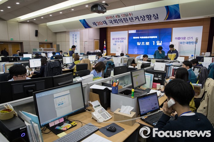 (과천=포커스뉴스) 2016 제20대 국회의원선거를 하루 앞둔 12일 오전 경기도 과천시 중앙선거관리위원회에 설치된 상황실에서 직원들이 업무를 보고 있다.