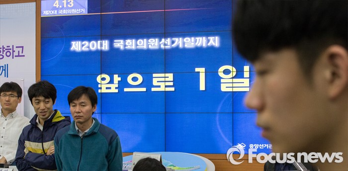 (과천=포커스뉴스) 2016 제20대 국회의원선거를 하루 앞둔 12일 오전 경기도 과천시 중앙선거관리위원회에 설치된 상황실에서 직원들이 업무를 보고 있다.