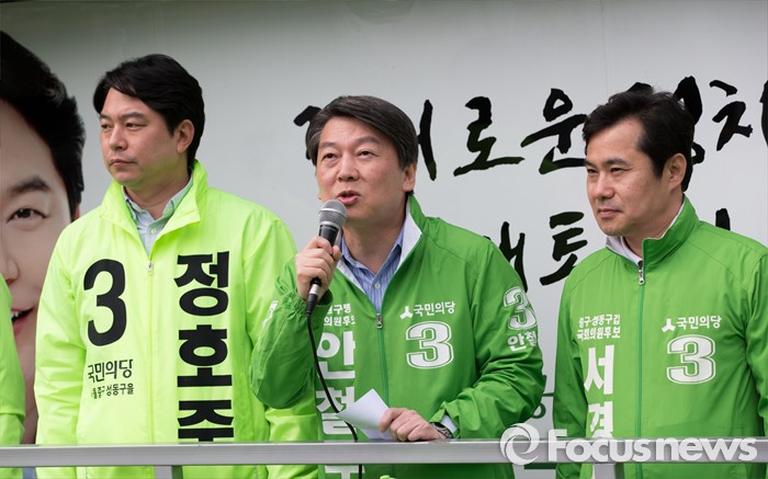 (서울=포커스뉴스) 안철수(가운데) 국민의당 상임공동대표가 12일 오전 서울 성동구 금장시장 앞에서 서경선(오른쪽) 중구성동구갑 후보와 정호준(왼쪽) 중구성동구을 후보 지원유세를 하고 있다.