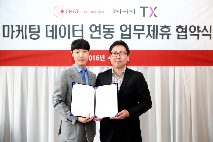 최영섭 차이커뮤니케이션 대표는 "이번 협약을 통해 차이의 독자 솔루션 큐브의 성과지표 분석방식 그대로 NHN TX의 고도화된 타겟팅 광고를 손쉽게 활용할 수 있게 돼 기쁘다"면서 "이를 통해 자사 클라이언트들에게 큐브를 통한 다양한 마케팅과 세일즈 분석뿐 아니라 정밀화된 타겟팅 광고를 제공함으로써 최고의 퍼포먼스를 실현할 것으로 기대한다"고 밝혔다.차이커뮤니케이션 최영섭 대표(좌)와 NHN TX 신희진 대표가 전략적 제휴를 위한 양해각서에 사인하고 기념촬영을 하고 있다. <사진제공=NHN엔터>