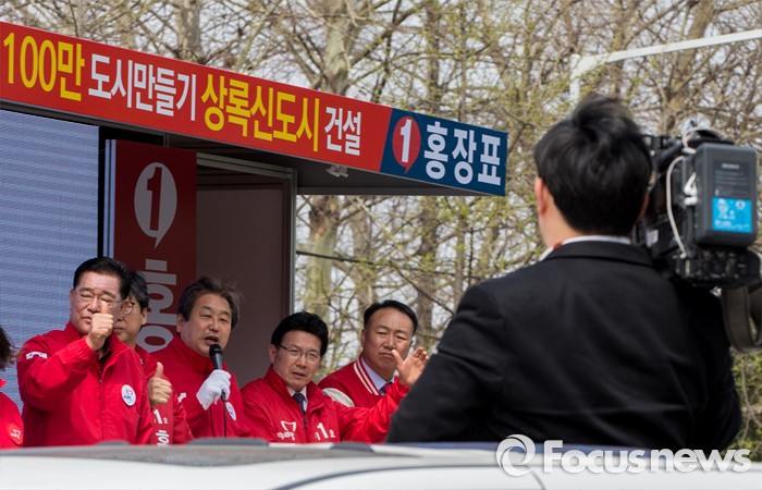 (안산=포커스뉴스) 4.13 총선을 하루 앞둔 12일 오전 경기 안산시 한대앞역 인근에서 홍장표 새누리당 안산시상록구을 후보 지원유세에 나선 김무성 대표가 유권자들의 지지를 호소하고 있다.