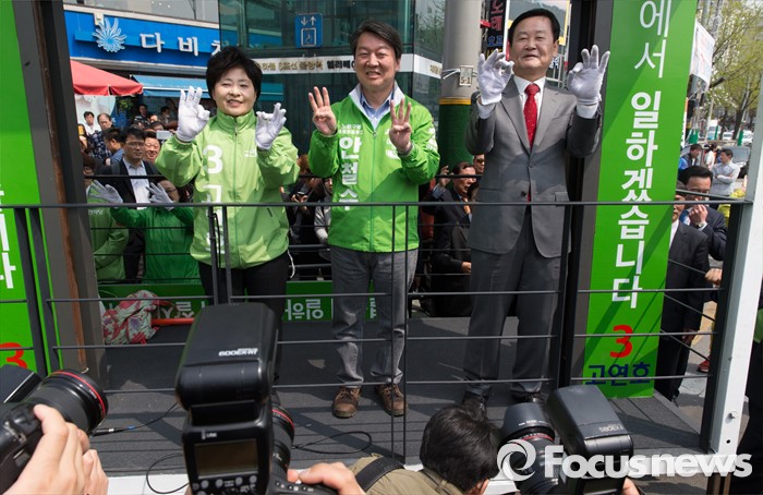 (서울=포커스뉴스) 안철수(가운데) 국민의당 상임공동대표가 12일 오전 서울 은평구 불광역 8번 출구 앞에서 고연호(왼쪽) 은평구을 후보 지원유세를 하고 있다.