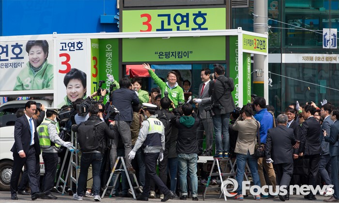 (서울=포커스뉴스) 안철수 국민의당 상임공동대표가 12일 오전 서울 은평구 불광역 8번 출구 앞에서 고연호 은평구을 후보 지원유세를 하고 있다.