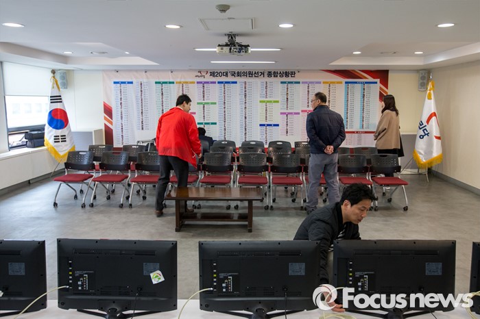 (서울=포커스뉴스) 제20대 국회의원선거를 하루 앞둔 12일 오전 서울 영등포구 새누리당사에서 관계자들이 선거상황실을 설치 하고 있다.
