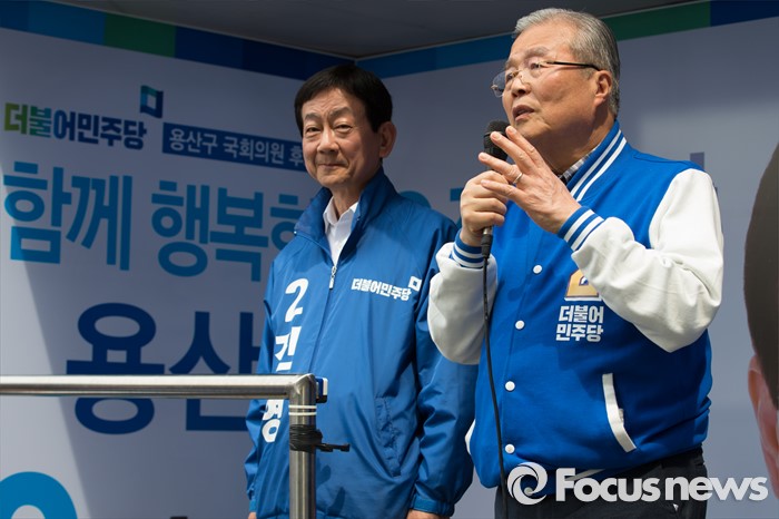 (서울=포커스뉴스) 2016 제20대 국회의원선거를 하루 앞둔 12일 오후 서울 용산구 후암시장 인근에서 김종인 더불어민주당 비대위 대표 겸 선대위원장과 진영 서울 용산구 후보가 유권자들에게 지지를 호소하고 있다.