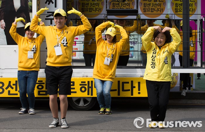 (고양=포커스뉴스) 제20대 국회의원 선거를 하루 앞둔 12일 오후 심상정 정의당 고양갑 후보가 경기 고양시 롯데마트 화정점 앞에서 율동을 선보이고 있다.