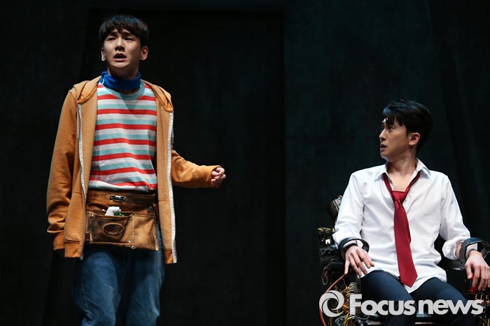 (서울=포커스뉴스) 12일 오후 서울 종로구 아트원씨어터에서 열린 연극 '지구를 지켜라' 프레스콜에 참여한 배우 키(왼쪽)와 강필석이 주요장면을 시연하고 있다.