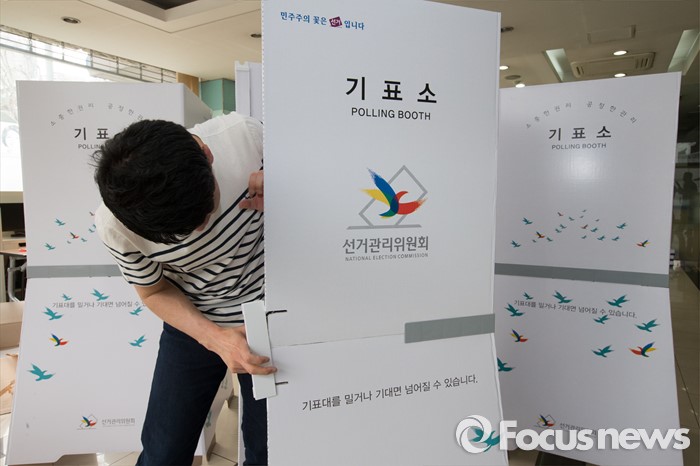 (서울=포커스뉴스) 4.13총선을 하루 앞둔 12일 오후 서울 성북구 보험연수원에 마련된 보문동 제2투표소에서 투표사무원이 기표소를 설치하고 있다