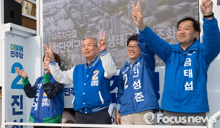 (서울=포커스뉴스) 2016 제20대 국회의원선거를 하루 앞둔 12일 오후 서울 강서구 발산역 인근에서 금태섭 더불어민주당 강서갑 후보, 진성준 강서을 후보, 김종인 비대위 대표 겸 선대위원장, 한정애 강서병 후보가 유권자들에게 지지를 호소하고 있다.