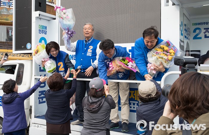 | △ 지지자들로부터 꽃다발 받는 더불어민주당 |